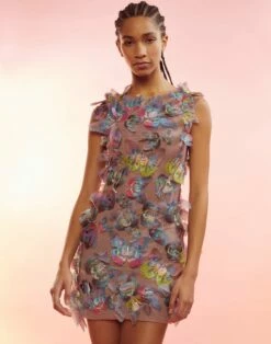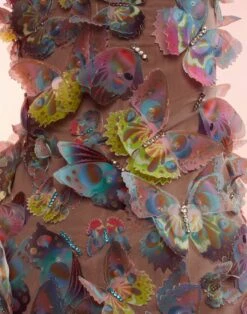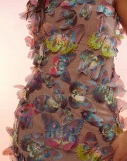 Butterfly embellished organza mini dress. This item is hand embellished and each piece is unique so appearance may vary.