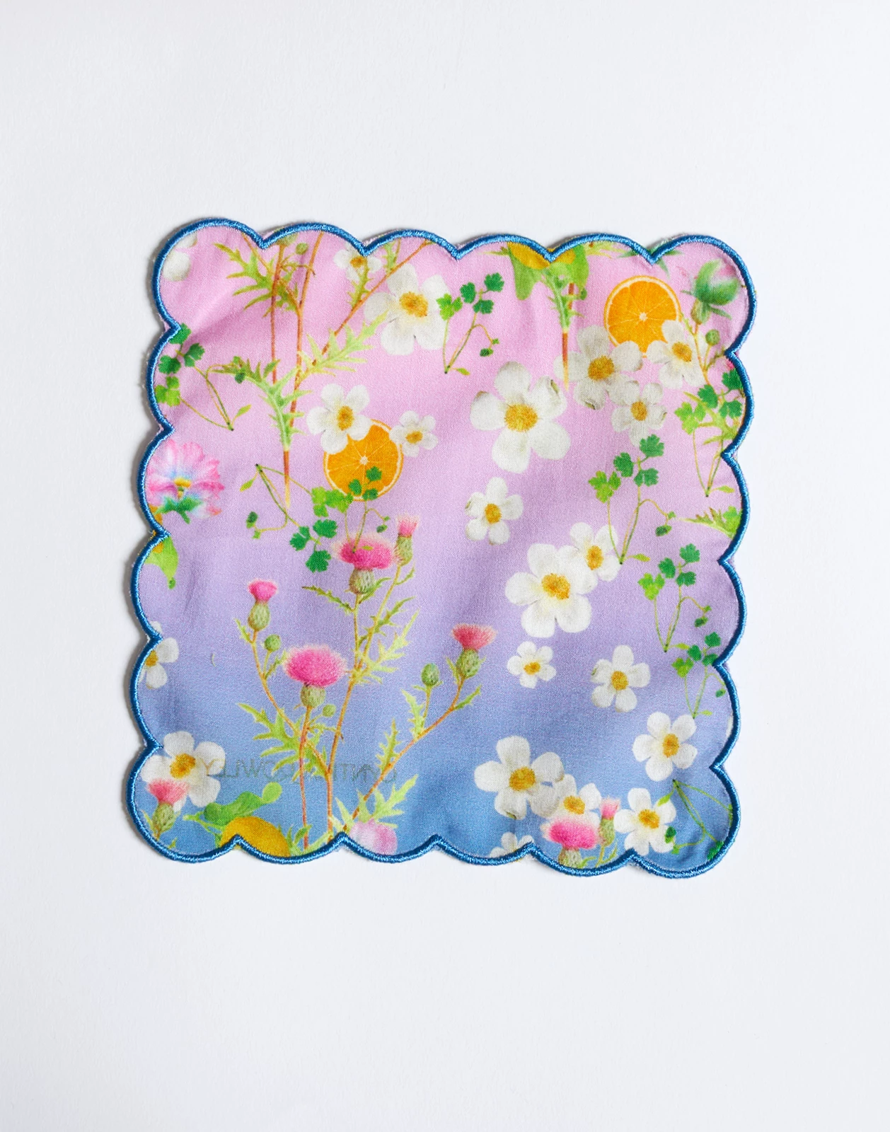 Printed cotton cocktail napkins with scallop embroidered edge.