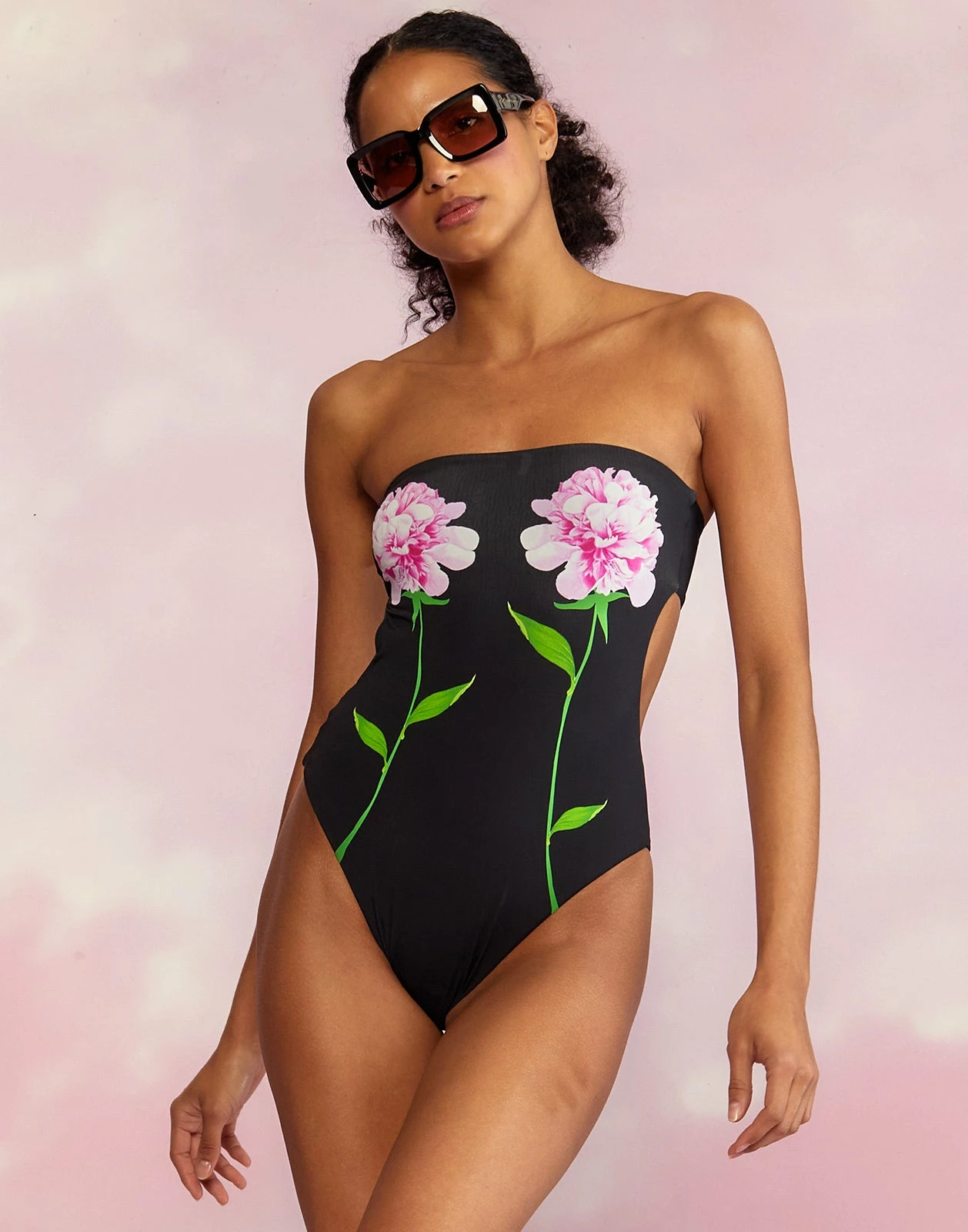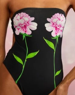 Cut out one piece strapless swimsuit with peony flower print. In a new buttery fabrication.