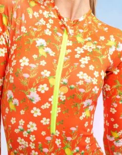 - Covered back zip with nylon pull and secure velcro closure at high neck