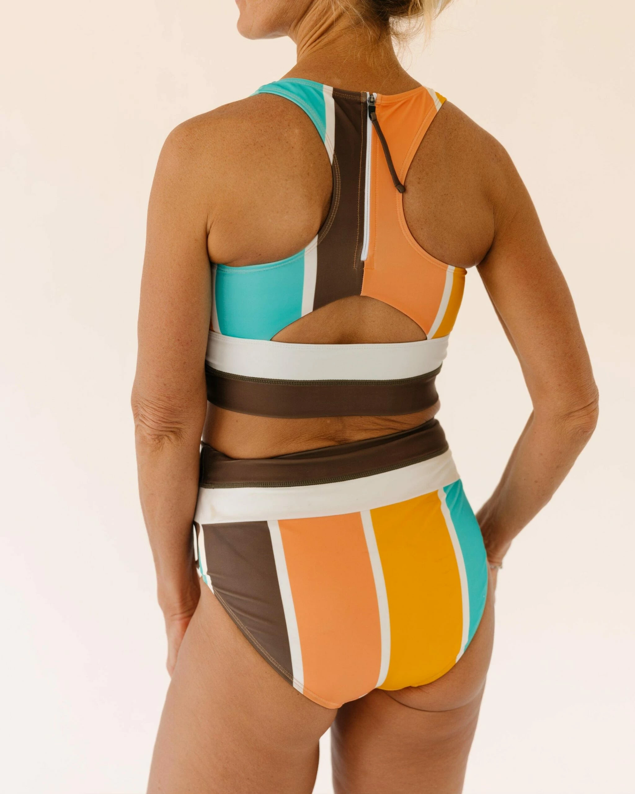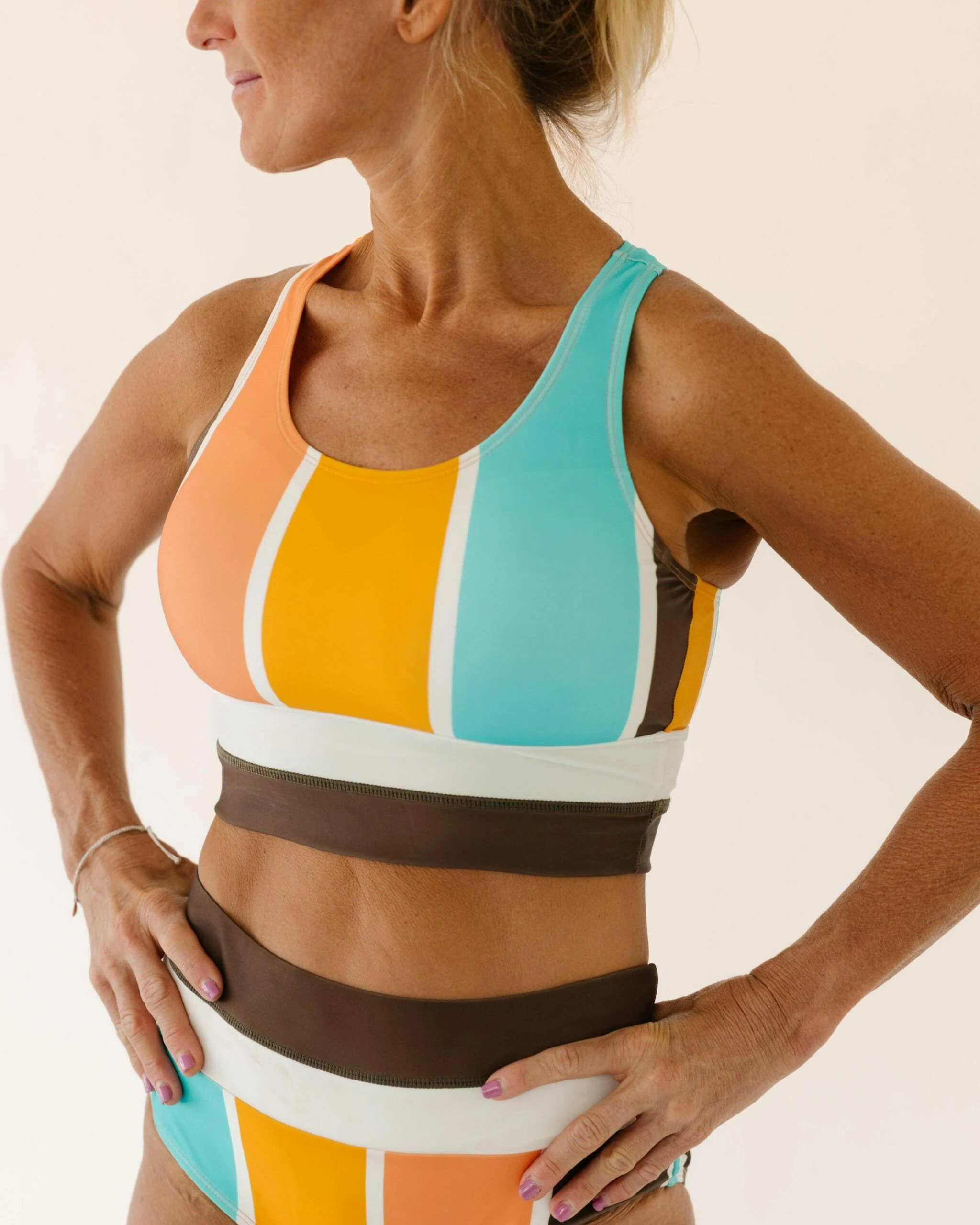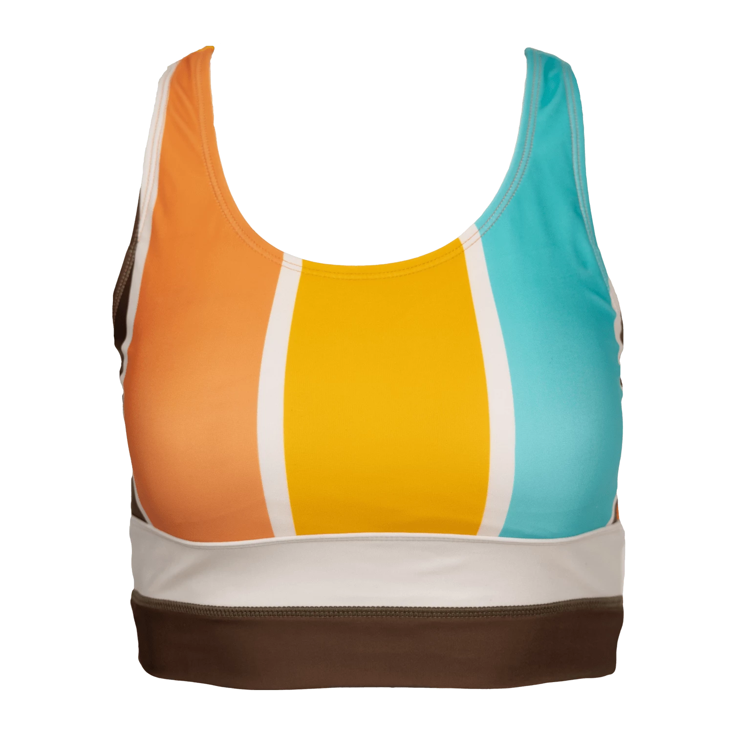 The Nani Cut Back Swim Crop offers the comfort and support of a favorite sports bra, designed as a hybrid for yoga class and all your outdoor adventures. The bold, thick stripes were made to keep you in style no matter where your journey takes you. Perfect choice if you are looking for maximum support! The Journey print will vary in placement on each suit, so yours may not be the same as pictured.