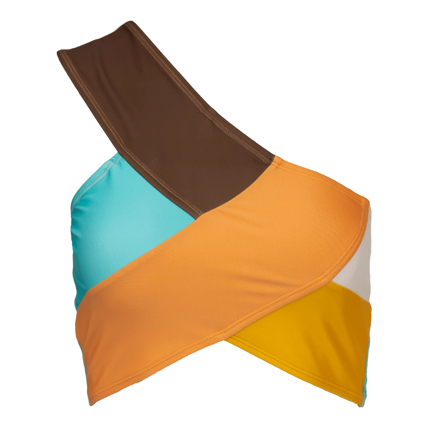 Looking for something NEW and DIFFERENT? This patchwork design is just what you have been waiting for! Now in a mix of bold, unique colors that are currently trending! The one-shoulder, flattering fit keeps you covered and secure while showing off your style as you confidently dive into all your outdoor activities.